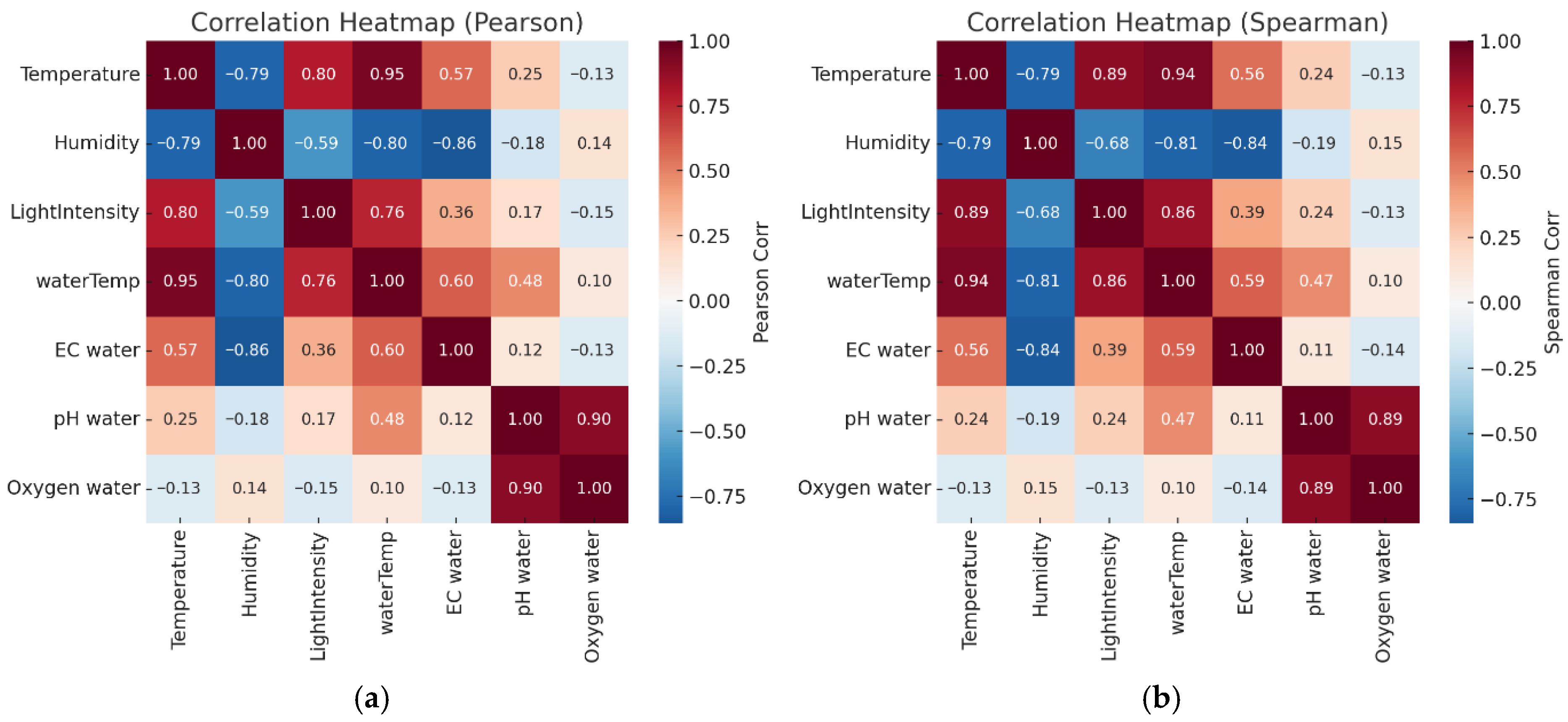 Correlation analysis revealed strong positive relationships between air temperature and water temperature (r = 0.94) and light intensity (r = 0.89), consistent with solar energy transfer dynamics. Relative humidity negatively correlated with temperature (r ≈ −0.80), as expected from meteorological principles. A notable correlation between DO and pH (r = 0.89) likely reflects phytoplankton photosynthesis, which increases both oxygen levels and pH during daylight hours [