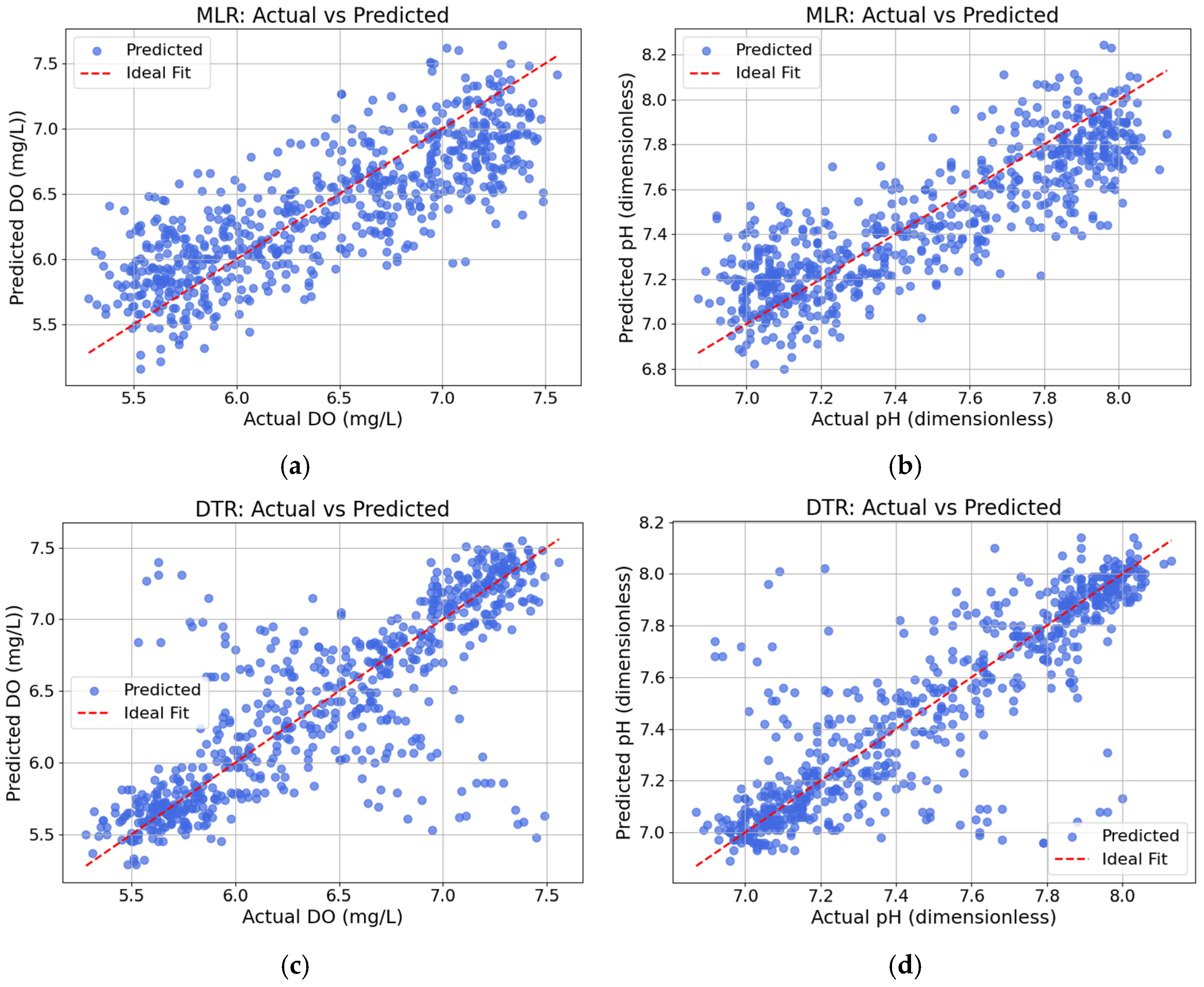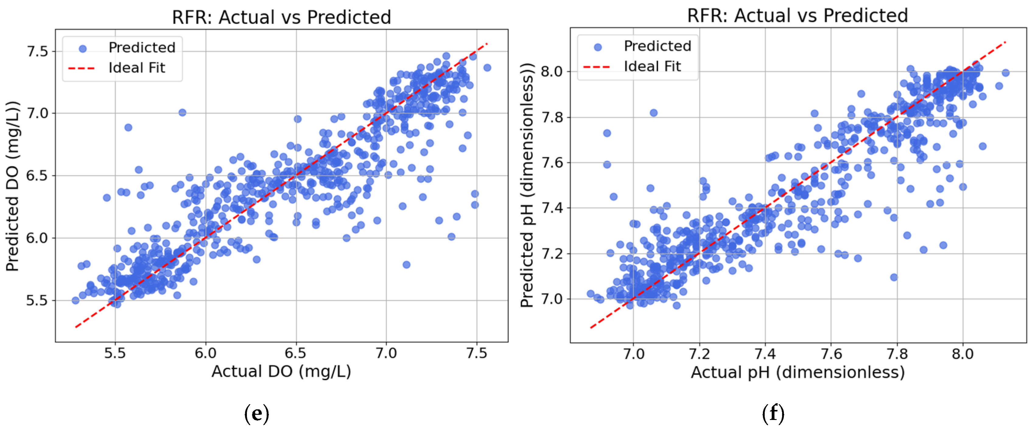 In developing machine learning models for water quality forecasting, MLR offered transparency and low computational cost, ideal for IoT devices like the ESP32. However, its linear nature limits its ability to model complex relationships. While DTR provided better nonlinearity handling, it was prone to overfitting without proper tuning. RFR emerged as the most accurate and stable model, with R