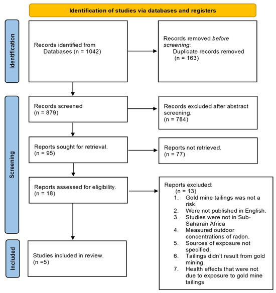 PRISMA flow diagram of the study selection. Of over 500 initial records, most were excluded because they did not incorporate IoT radon monitoring. Only five studies met the inclusion criteria, reflecting the field’s early stage.