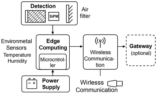 The sensing mechanism used in an IoT radon detector is key to its performance, as it affects the device’s sensitivity, response time, energy consumption, and autonomy. One of the most common technologies is the PIN photodiode sensor, which works by collecting radon progeny electrostatically and detecting alpha particles through a solid-state semiconductor [20]. These sensors are popular in low-power designs because of their lower intrinsic sensitivity and vulnerability to environmental noise, which require longer integration times and careful signal processing to ensure accurate data [30]. A more advanced option is the use of silicon photomultipliers (SiPMs, Figure 2) combined with scintillators. In this setup, alpha particles from radon decay events cause light emissions within a scintillating medium, which are then amplified and measured by the SiPM. This method offers a significant improvement in detection sensitivity and timing accuracy [31]. SiPM-scintillator arrays have proven particularly useful in research applications and volcano monitoring, where both sensitivity and durability are essential [32]. However, their higher power consumption and need for analog signal processing circuits can make integration into long-lasting, battery-powered embedded systems more challenging. Another category of radon sensors used in IoT platforms relies on metal-oxide-semiconductor (MOS) technologies, such as those found in commercial devices like RadonEye. These sensors operate by detecting changes in conductivity resulting from radon-induced ionization in the surrounding air. While they are cost-effective and provide immediate reading, they tend to experience calibration drift over time and are sensitive to humidity, temperature, and other interfering gases [33]. Consequently, deploying them in critical infrastructure requires ongoing recalibration or the use of software-based drift correction models [34]. Recent innovations have explored the use of microelectromechanical systems (MEMS) and nanomaterials, such as graphene-based composites, to develop radon detectors that combine miniaturization with enhanced sensitivity [35,36,37]. Although these technologies are still primarily in the experimental stage, their potential to alter IoT radon sensing through ultra-low-power operation and high spatial resolution is significant and warrants further research. The core hardware structure of a typical IoT radon sensor node is illustrated in Figure 1, which depicts the modular design, including sensing, environmental compensation, edge processing, wireless communication, and power supply.