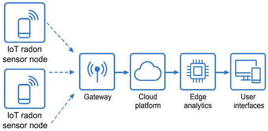 Commercial radon detectors and many prototype IoT platforms use metal oxide semiconductor (MOS) sensors, which identify shifts in conductivity triggered by ionizing radiation in the air. These sensors are affordable, deliver near-instant readings, and are ideal for consumer devices. However, their accuracy can decline over time due to baseline drift influenced by temperature, humidity, and interfering gases. While recalibration can counteract this, it poses practical challenges for large-scale distributed systems. Recent developments in environmental IoT aim to solve this by employing software algorithms, often based on statistical or machine learning techniques, to correct for drift and ensure long-term reliability without frequent manual recalibration [33,34]. Looking to the future, the use of microelectromechanical systems (MEMS) and nanomaterials presents an exciting opportunity. Researchers are exploring new composites like graphene-based films and nanostructured metal oxides for their distinctive electrical and chemical traits, which provide ultra-high sensitivity, quick response times, and low power consumption [36]. While these technologies remain largely experimental, they closely match the requirements of IoT-enabled radon monitoring, such as miniaturization, energy efficiency, and dense deployment capability. If these sensors can be scaled successfully, they could enable ongoing radon monitoring in areas that now lack such capabilities due to power limitations. Beyond the sensing materials themselves, wider trends in IoT design also affect radon monitoring. Reviews of low-power environmental sensors emphasize the move toward embedding computational capabilities within the sensing node, enabling basic signal processing, noise filtering, and anomaly detection to occur before data is transmitted [82]. This edge intelligence decreases communication demands, prolongs battery life, and ensures only the most pertinent data reaches the cloud. Likewise, advances in energy harvesting, such as piezoelectric and thermoelectric generators, allow sensors to generate power from ambient vibrations, temperature differences, or light. Recent research indicates that combining harvesters with IoT nodes can increase their lifespan by up to nine times, which is highly relevant for radon systems placed in remote or hard-to-access areas [84]. Current IoT radon systems mainly use PIN photodiodes or MOS detectors, but further designs are likely to combine sensitivity of scintillator-SiPM systems with the efficiency of MEMS and nanomaterials. Advances in edge processing and energy harvesting may also reduce calibration drift and extend battery life. Viewing radon sensing within the larger development of IoT sensor technology shows that innovations in air quality, industrial safety, and environmental hazard detection can accelerate progress in radon IoT solutions, leading to more reliable, affordable, and accessible exposure assessments.