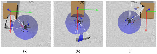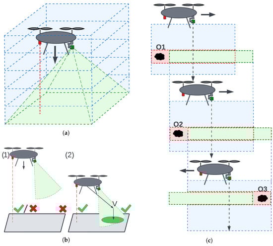 Landing procedure: (a) anticollision corridor, (b) landing phases (1)—descend, (2)—spot detection and landing, (c) anticollision behavior on descend. O1–3—obstacles. Blue areas—flight corridors, green cones—camera FOV, red dashed line—altimeter measurement. Green check mark on (b)—either altimeter or camera in measurement range. Red cross—sensor out of range. Green boxes in (c)—free space that avoids obstacles, Red boxes in (c)—collisions with obstacles.
