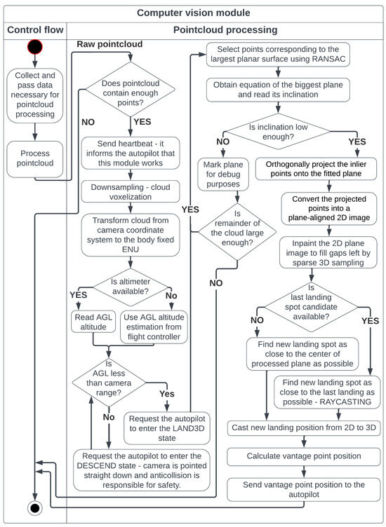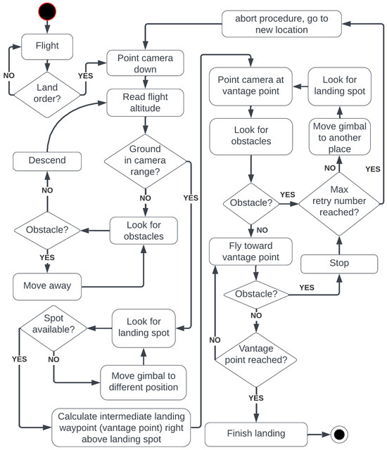 If detection remains stable across multiple frames and the flight corridor is clear, motion toward the vantage point directly above the landing site begins. If the corridor is cluttered, the anti-collision module calculates a new gimbal orientation, pans to a fresh sector, and restarts landing-site detection. If the point proves unstable, the UAV searches for a new landing site farther away. A diagram of this algorithm is presented in Figure 2.