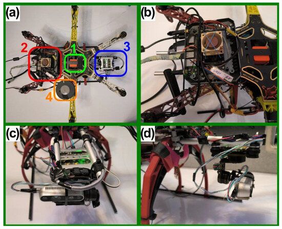 Figure 3 shows the UAV in its laboratory testing configuration. The propellers are removed, electronics are powered via a cable, and the onboard computer is not rigidly strapped to the frame to allow easier access. In Figure 3a, we can see the main components: