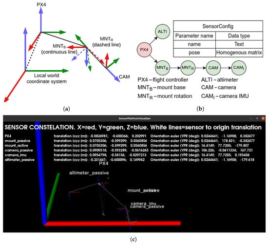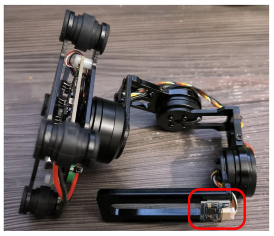 - Gimbal with RGB-D camera (blue rectangle): Storm32 BGC V1.32 gimbal [51] and Intel RealSense D435i [52]. The gimbal is shown in more detail in Figure 4.