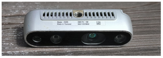 The Intel RealSense D435i camera (Figure 5) is a hybrid stereo RGB-D camera. Depth perception is provided by a stereo pair of Near-Infrared (NIR) OmniVision OV9282 sensors, coupled with an IR laser structured-light projector [52,54]. This gives the camera its hybrid functionality; in daylight, where the IR laser is turned off or blinded by sunlight, the camera operates as a classic passive stereo vision device. However, in low-light conditions or when the scene lacks texture, structured lighting provides the missing data, enabling operation at night.