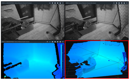 Example screens from the Intel RealSense Viewer software 2.53.1. The top images display NIR IR images from the stereo pair, with white dots indicating the effect of IR structured lighting. The bottom left image shows the depth map, and the bottom right (red rectangle) shows the resulting point cloud.
