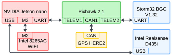 Simplified diagram of the electrical connections. TELEM1 and TELEM2 are serial port names of the Pixhawk 2.1 carrier board. Colors are kept consistent with those used in Figure 3.