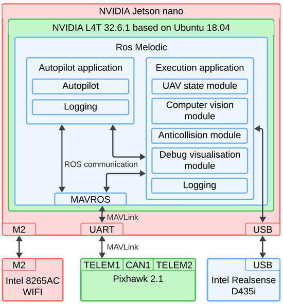 Software and hardware cooperation. Software blocks are shown in the wider context of ROS, operating system and Jetson nano SBC itself. Colors of the hardware components are kept consistent with those used in Figure 3. Colors of NVIDIA L4T 32.6.1 and Ros Melodic are added just for visual aid.