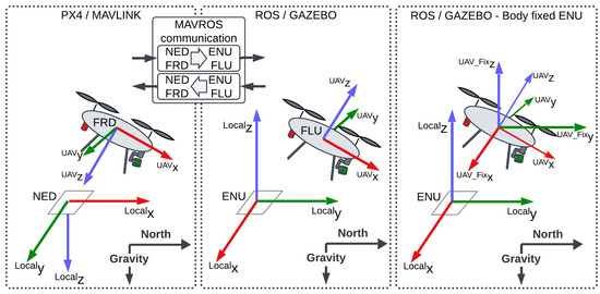 The flight controller uses the PX4 flight stack, which supports installation on both flight controllers and PCs [56]. On a PC, PX4 can be used with simulation environments—Gazebo was used in this work. Communication between the Jetson Nano and the flight controller is via UART serial port using the MAVLink protocol. MAVLink messages are not automatically recognized as ROS topics. To bridge this gap, the MAVROS package was used, which translates MAVLink messages into ROS topics and handles data conversion between MAVLink and ROS conventions.