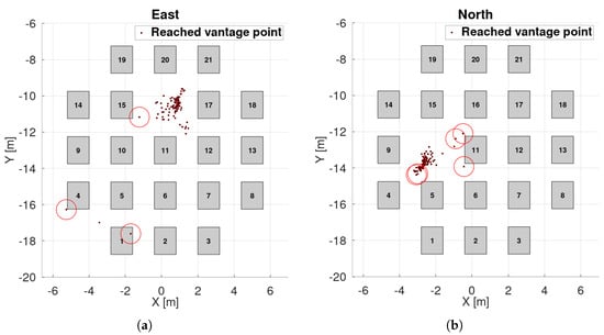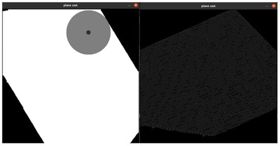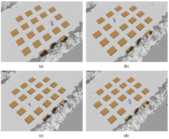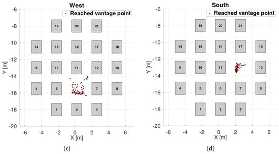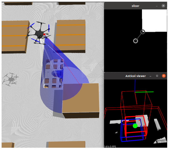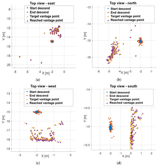Simulations covered all system modules. During these runs, flight altitude was provided by a rangefinder. Thanks to active gimbal control, the camera’s narrow field of view was no longer a limitation—the gimbal continuously tracks the point currently under evaluation, allowing landing sites to be selected anywhere around the UAV. Repeatability and intrusion-response tests confirm that the method works across all azimuths, with candidate points analyzed regardless of their bearing. The range of behaviors considered here exceeds those in previous studies, which often lacked collision avoidance and the ability to operate beyond the depth camera’s range.