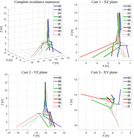 During the descent phase the prospective pad lies outside the depth camera’s range (case 1 in Figure 1b). The gimbal keeps the camera pointed vertically downward, and the aircraft follows a slow, vertical path. Due to the camera’s field of view and the motion occurring along the camera’s optical axis, the anti-collision module monitors the volume along and around the flight path (Figure 1a). If an obstacle is detected, a minimal safe translation is calculated. The UAV performs a lateral translation to safely avoid the obstacle and continues descending. The magnitude of this translation corresponds to the minimal safe lateral displacement times a safety margin; the direction is chosen to minimize displacement. This procedure is illustrated in Figure 1c.