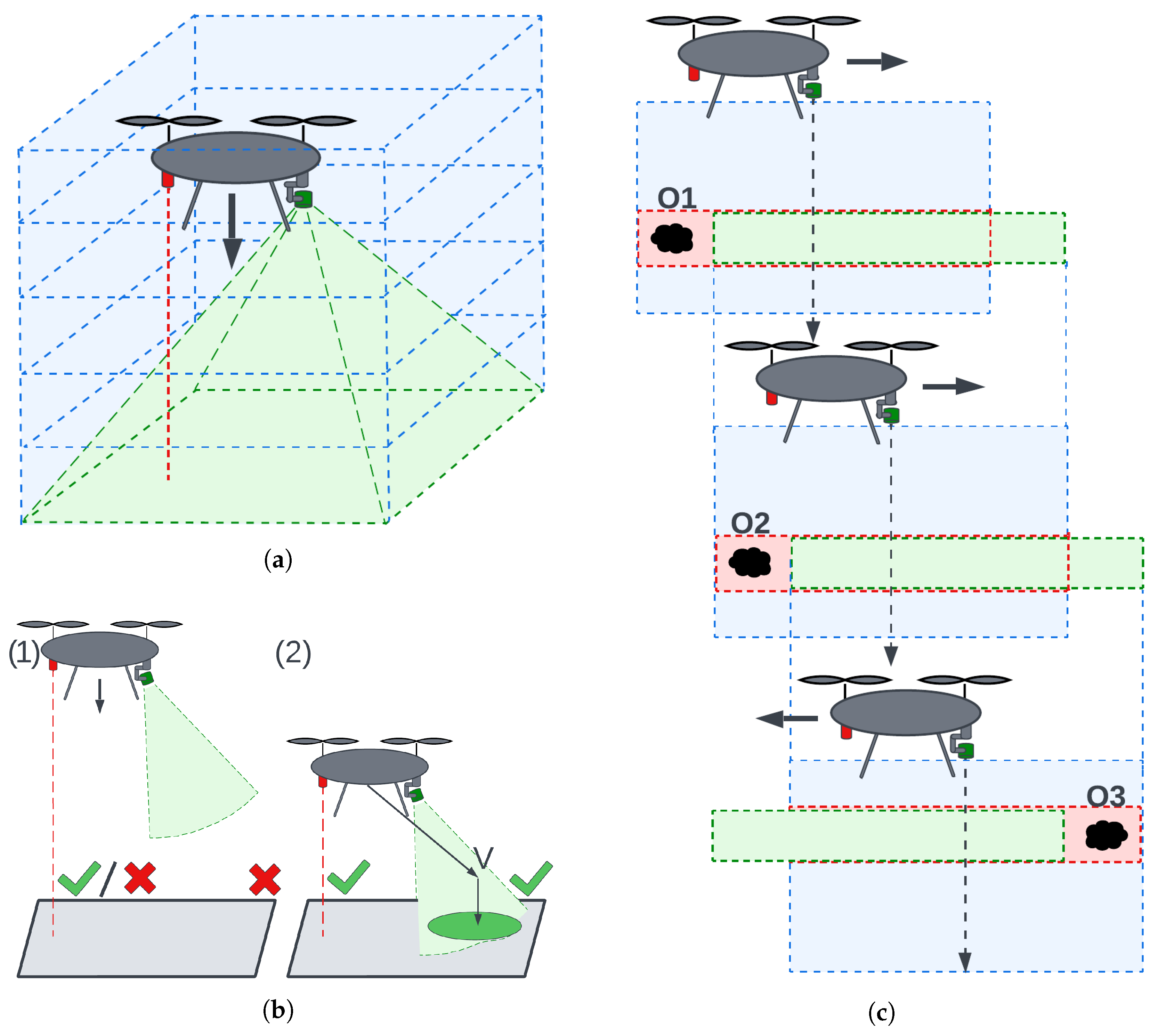 - Scenario 4—Forced Landing ZoneObstacles are arranged from the beginning to constrain the free area, forcing the algorithm to find an admissible approach point within a narrow corridor, rather than reacting to obstacles added later (Figure 23f).