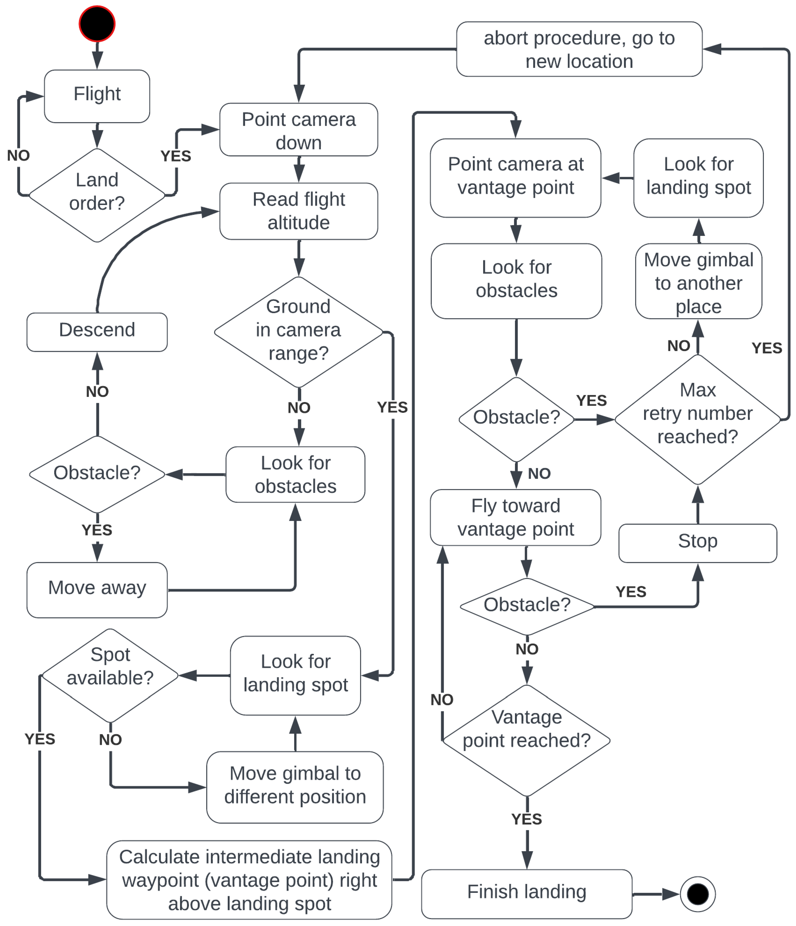 - Usage of the gimbal motion during the landing procedure to counter the narrow field of view of the camera.