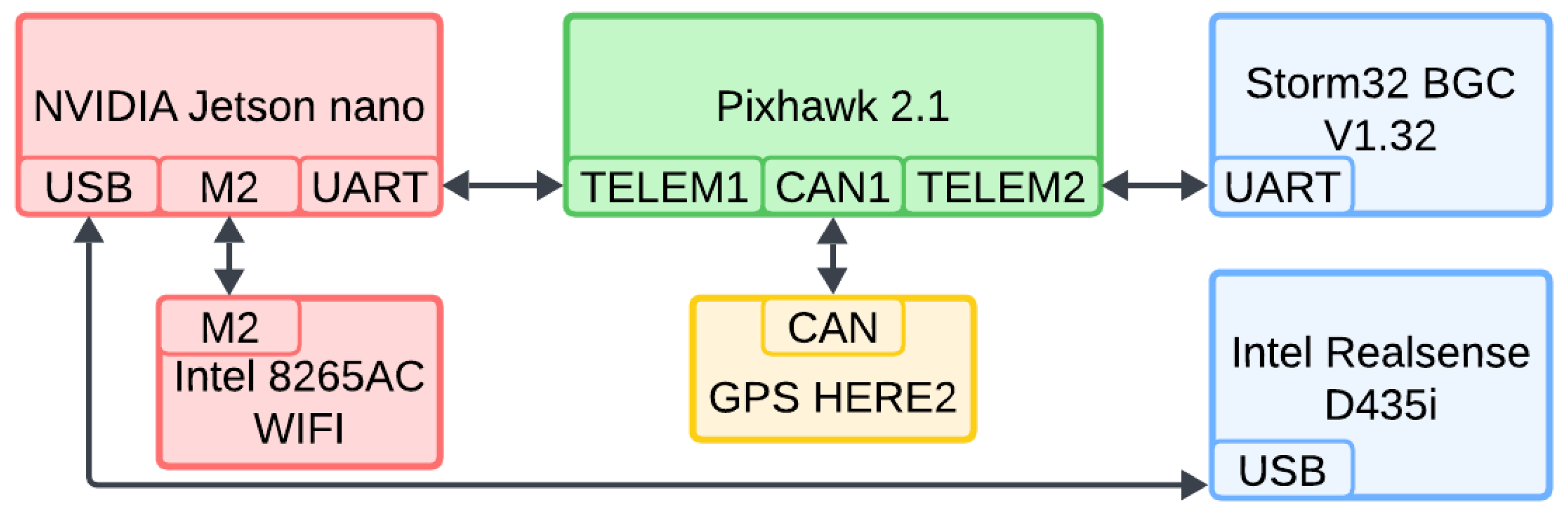 - Flight controller (green rectangle): Pixhawk 2.1—CubePilot Cube Orange on a carrier board [49].