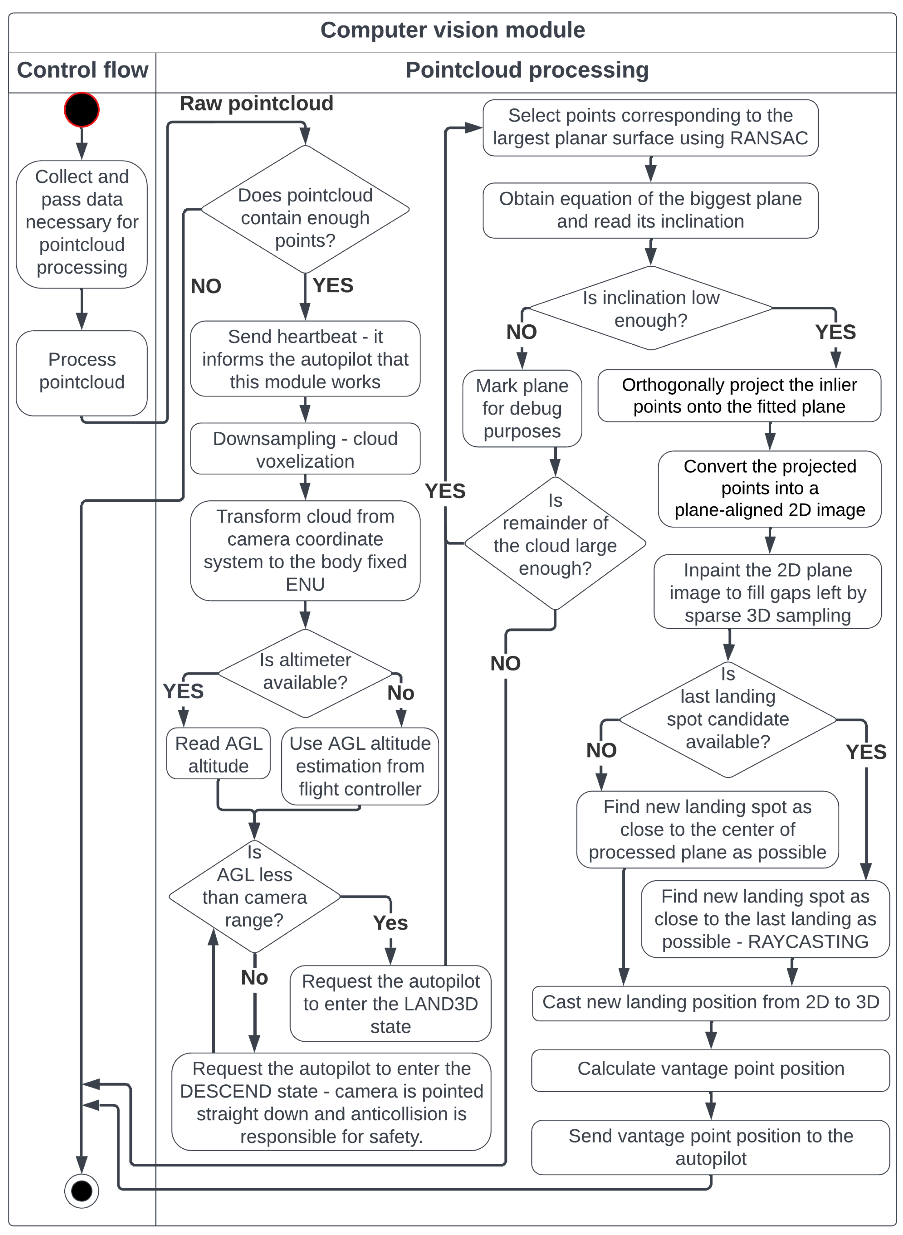 - A new landing procedure that is compatible with a close-range imaging sensor in the form of an RGB-D camera. The algorithm is lightweight enough so that it can be executed onboard using an SBC with limited computing power like the Jetson nano.