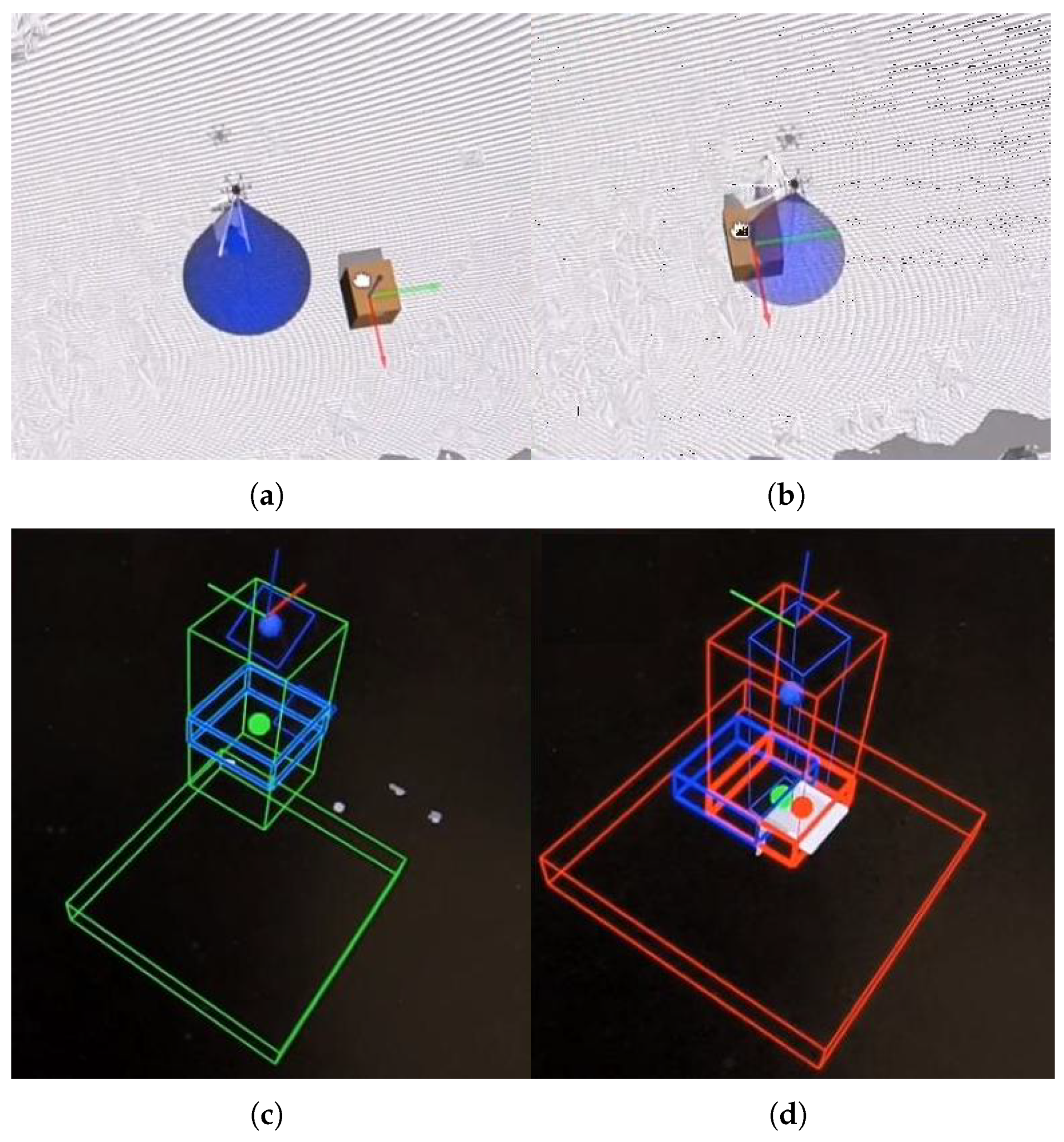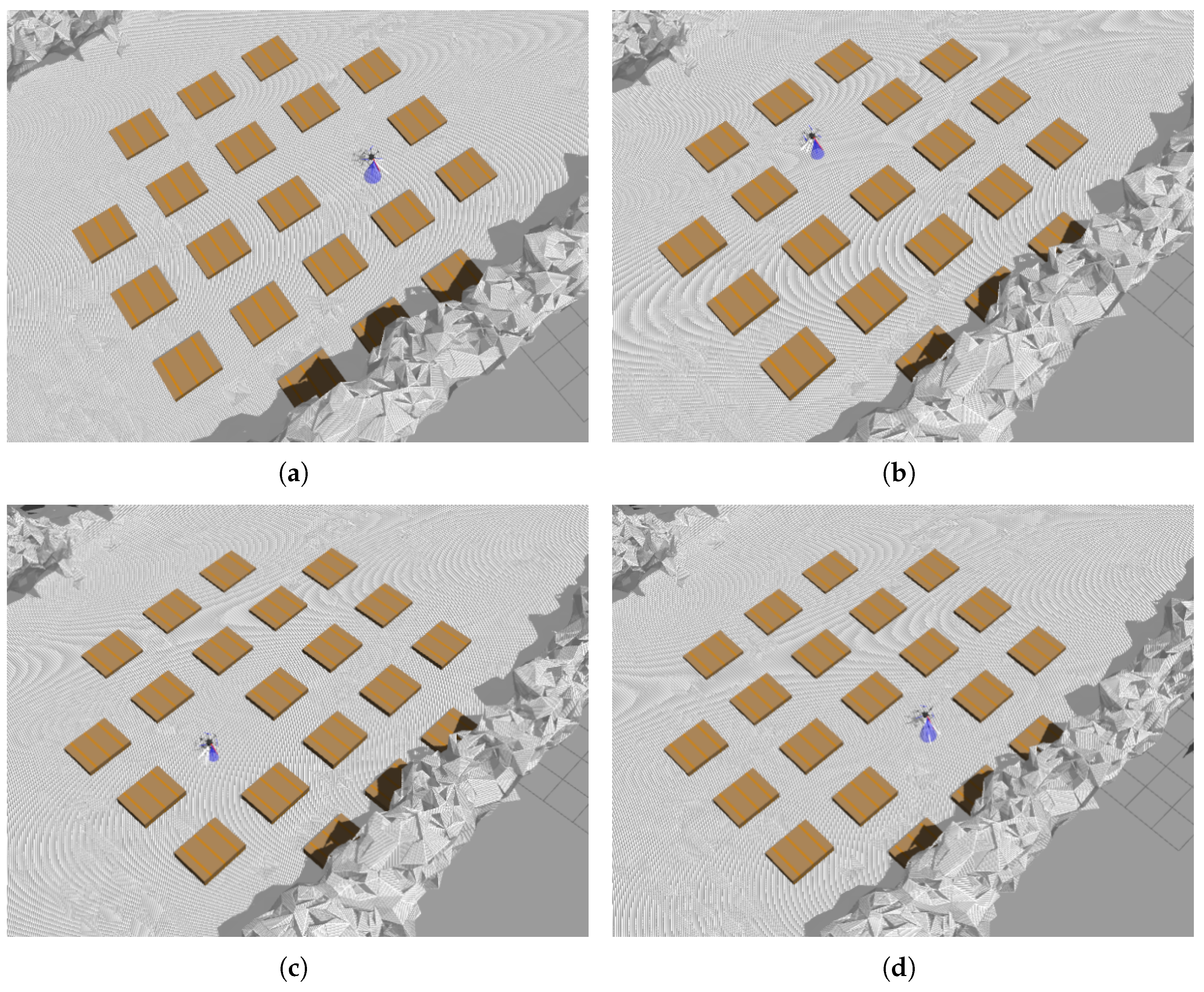 - Scenario 2—Two ObstaclesThe new landing site chosen in Scenario 1 is now blocked by a second obstacle. The algorithm must relocate the landing site to a third, distinct position (Figure 23d).