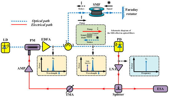 The experimental setup for the low-threshold, frequency-stable temperature sensing method based on an SBS OEO is illustrated in Figure 1. The system consisted of a laser diode (LD), phase modulator (PM), erbium-doped fiber amplifier (EDFA), optical circulator (OC), single-mode fiber (SMF), Faraday rotation mirror (FRM), photodetector (PD), low-noise amplifier (LNA), electrical power splitter, tunable microwave attenuator (TMA), microwave amplifier (AMP), and electrical spectrum analyzer (ESA). Continuous-wave light from the LD was phase-modulated by the PM and driven with microwave signals, then amplified through the EDFA before propagating along the SMF via the OC. The FRM enabled double-pass Brillouin interaction by reflecting the optical wave through the SMF twice, which effectively reduced the SBS threshold while mitigating polarization-induced fluctuations. The backward-propagating Brillouin-scattered light interacted with the forward-propagating pump wave and generated a narrowband microwave photonic filter response that was converted into electrical signals via the PD. This microwave signal underwent amplification through cascaded LNA and AMP stages, with the TMA providing closed-loop gain control to sustain stable oscillation. The system’s frequency–temperature correlation was ultimately characterized by the ESA utilizing spectral analysis of the sustained microwave oscillations.