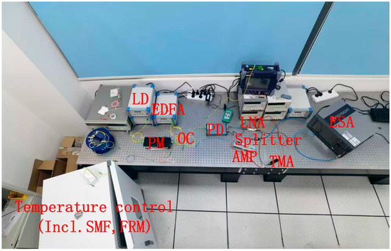 Figure 2 shows the actual experimental setup based on the structure depicted in Figure 1. The experimental setup utilized a 5 km spool of G.652 single-mode fiber as the sensing element. The 5 km length of the sensing fiber was selected to optimize the oscillator’s frequency stability. The double-pass configuration enabled by the FRM results in an effective cavity length of 10 km. This length produces a mode spacing of approximately 20 kHz, which effectively suppresses adjacent modes and yields superior phase noise performance. Furthermore, this length provides a sufficient Brillouin gain medium to achieve a low SBS power threshold, fulfilling the primary objective of this work. The setup was driven by a tunable laser source (1529–1563 nm wavelength range) with a maximum output power of 13 dBm (20 mW). The EDFA stage provided 27 dB optical gain with a 5.8 dB noise figure and 19 dBm saturated output power, while the phase modulation was implemented using an iXblue MPZ-LN-20 modulator (Saint Germain en Laye, France) with a 20 GHz bandwidth. Detection was performed using a U2T BPRV2125AM (Berlin, Germany) photodiode featuring a 31 GHz bandwidth and 0.5 A/W responsivity, complemented by a Faraday rotation mirror with 45° polarization rotation to ensure polarization insensitivity. The OEO loop maintained 35 dB RF gain through cascaded amplification stages. The sensing fiber was placed in a high-precision thermal chamber (LiChen Instruments LC-HN-60BSG Shaoxing, China), which provided stable temperature control from 5 °C to 100 °C with 0.1 °C resolution and an overall system accuracy of ±0.5 °C. Key experimental components and their parameters are summarized in Table 1.