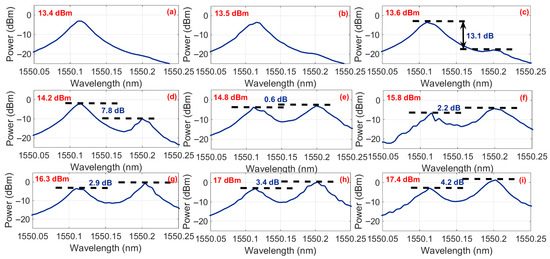 Figure 3 presents the optical spectra for varying EDFA output power levels with the FRM integrated into the system. Below the critical threshold of 13.6 dBm EDFA output power, no Stokes light generation was observed, confirming the absence of SBS. As the EDFA power exceeded 13.6 dBm, the onset of SBS became evident with Stokes light emerging at a wavelength offset of 0.09 nm (corresponding to an ~11 GHz frequency shift at 1550 nm) from the pump wave. The measured Stokes power reached −17.3 dBm, while the pump maintained a 13.1 dB power dominance over the Stokes component. At the injected optical power of 15.8 dBm, the power difference between the pump and Stokes waves is minimized.