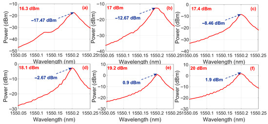 Figure 4 demonstrates the optical spectral characteristics without FRM integration for varying EDFA output power levels. At the 16.3 dBm EDFA output power, the Stokes light intensity reached −17.47 dBm, confirming SBS generation for the threshold criteria defined in Figure 3c and thereby establishing 16.3 dBm as the SBS power threshold for the non-FRM configuration. A progressive increase in the EDFA output power beyond this threshold amplified the Stokes light intensity, achieving 1.9 dBm at the 20 dBm pump power.