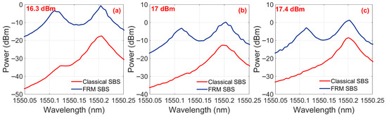 Comparative output optical spectra of FRM-enhanced SBS versus conventional SBS configurations for varying EDFA output power. (a) 16.3 dBm. (b) 17 dBm. (c) 17.4 dBm.