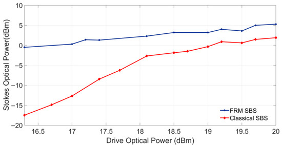 Figure 5 illustrates a comparison of the output optical spectra of FRM-enhanced SBS versus conventional SBS configurations for fixed EDFA output power, demonstrating the Faraday rotation mirror’s capability to boost Stokes signal power through double-pass interaction enhancement. The measured Stokes optical power versus pump power characteristics (Figure 6) revealed critical performance enhancements enabled by FRM integration. At the 18.1 dBm pump power, the FRM-enhanced SBS configuration generated 2.3 dBm Stokes power, exceeding the classical SBS output (−2.7 dBm) by 5 dB.