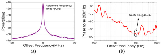 The system’s output microwave signal characteristics and phase noise performance. (a) Spectral profile at 30 °C: Dominant oscillation peak at 10.8675 GHz with the power level of −10 dBm (Span: 100 MHz, RBW: 9.1 kHz). (b) Phase noise curve.