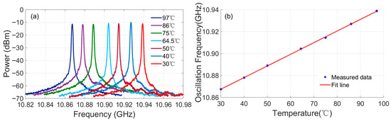 Figure 8 characterizes the temperature-dependent frequency response of the OEO system. By applying controlled temperature variations to the sensing single-mode fiber (SMF), the resulting oscillating microwave signals were captured using an electrical spectrum analyzer (ESA). Figure 8a displays overlaid spectra of the generated microwave signals across the tested temperature range. Figure 8b presents the corresponding oscillation frequency as a function of temperature. The data reveal a linear increase in the oscillation frequency from 10.8675 GHz at 30 °C to 10.9388 GHz at 97 °C. Linear regression analysis yields the following relationship: