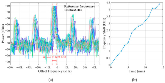 Figure 9a illustrates the frequency drift characteristics over time. Measured at one-minute intervals across a 14 min period, the center frequency exhibited a consistent leftward drift, accumulating a total shift of 4.40 kHz. This corresponded to a highly precise temperature error rate of 0.004 °C. Figure 9b presents this temporal evolution as a line graph. The figure clearly depicts the gradual frequency decrease of 4.40 kHz over the observation window.