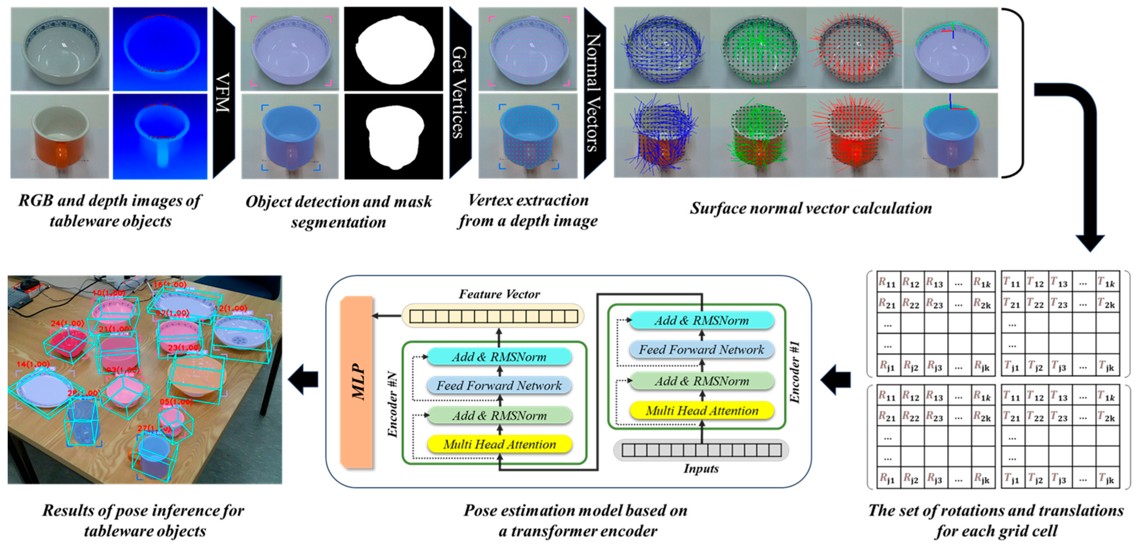 Through experiments on ten categories of tableware, the method demonstrated robust performance, achieving average rotational and translational errors within practical tolerances for robotic manipulation. Additionally, deployment on a mobile robot equipped with a manipulator confirmed the method’s real-world applicability by achieving an 84% grasping success rate in demonstration scenarios.