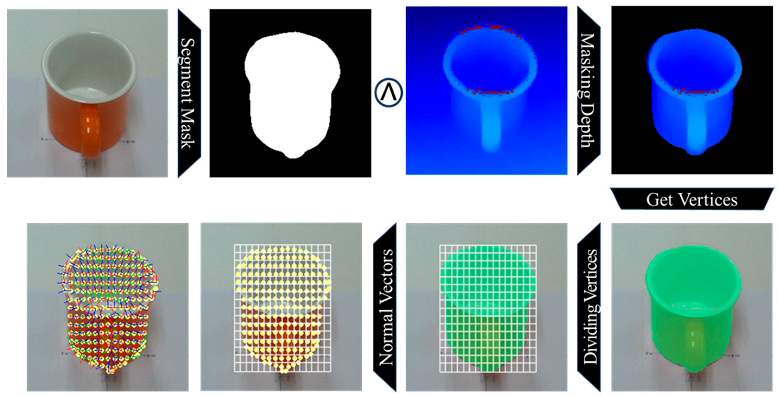 Since the size of the masked region depends on the object’s distance from the camera, the region is normalized by dividing it into a fixed-resolution grid (e.g., 16 × 16 cells). Each grid cell contains dozens to hundreds of 3D vertices derived from the masked depth values. We compute the surface normal vector for each cell by applying singular value decomposition (SVD) to the local set of vertices. SVD captures the dominant orientation of the local surface patch, providing a robust estimate of the normal vector despite sensor noise or partial occlusion.