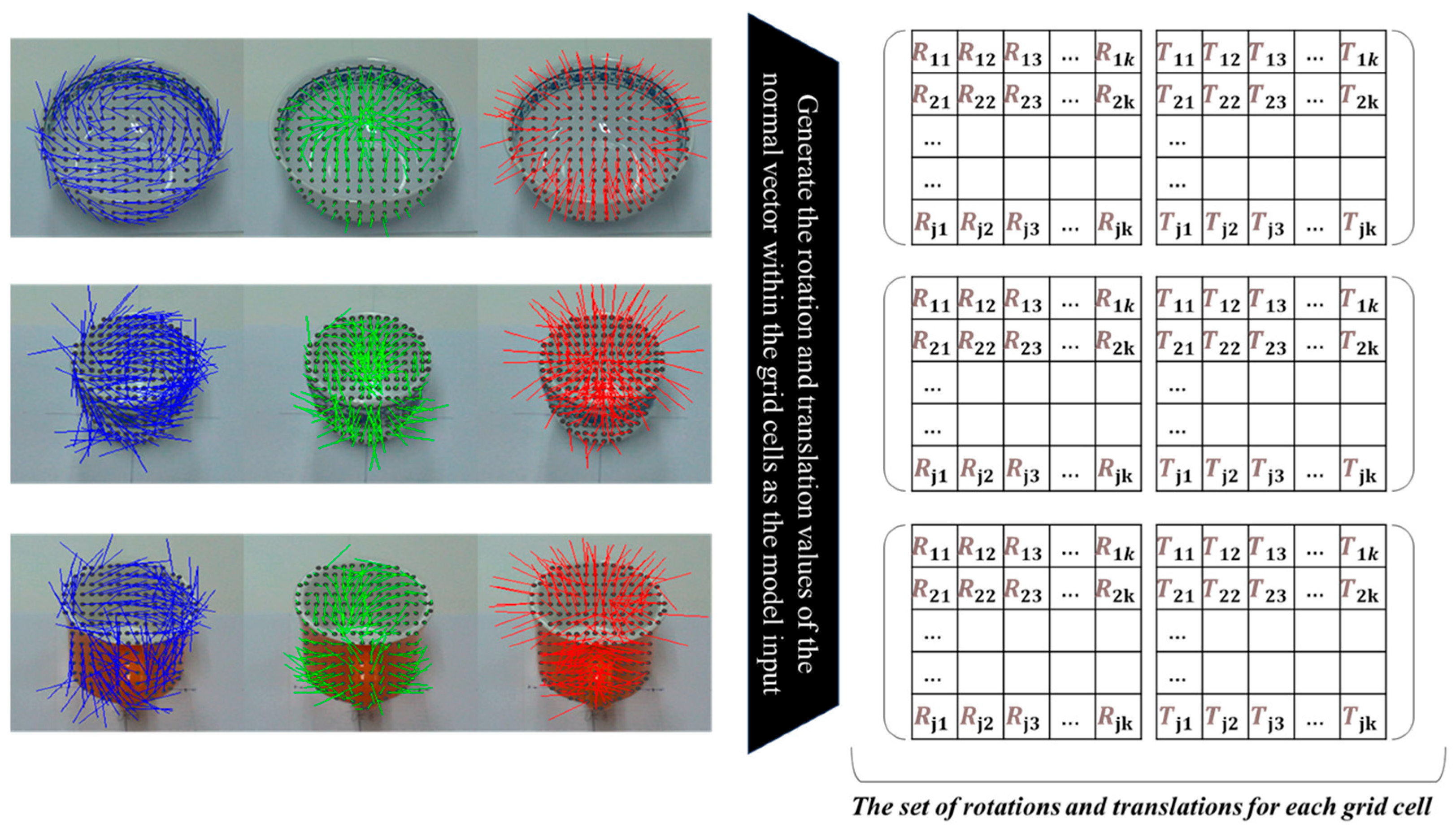 Figure 4 presents the subsequent computation of normal vectors for the vertices within each grid cell and the generation of input features for the pose estimation model.