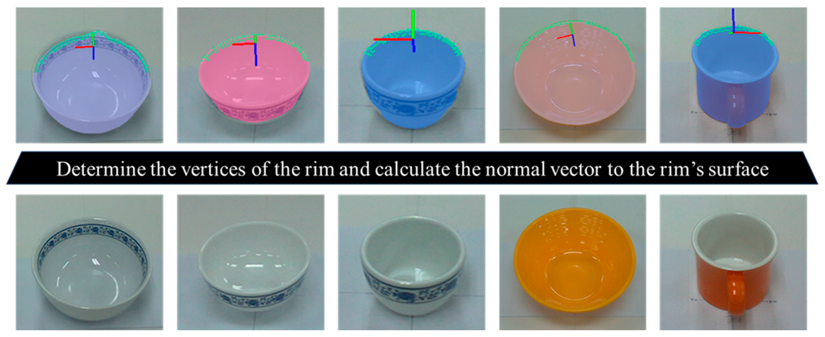 Figure 5 shows the vertices and normal vectors of the upper rim of a tableware object, extracted based on the object’s outer contour.