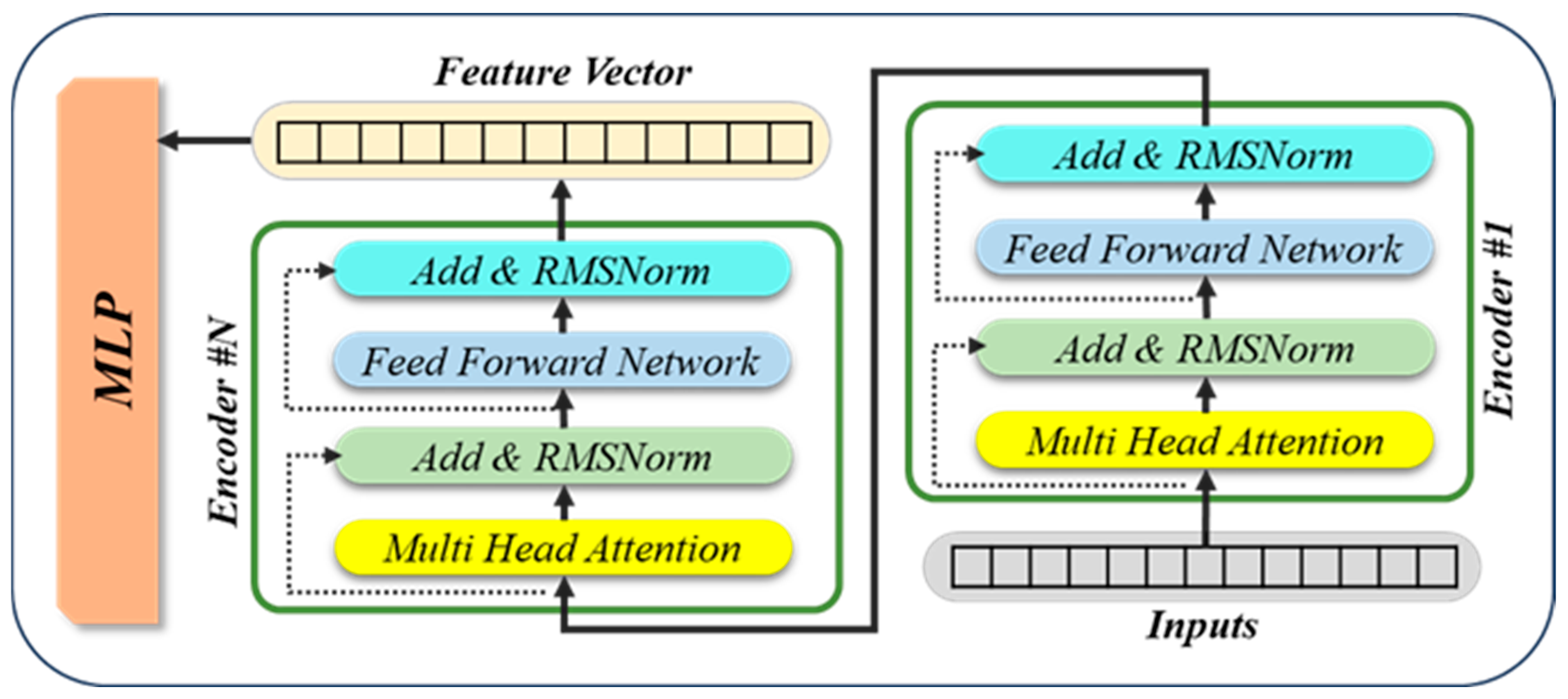 35]. RMSNorm normalizes inputs based on the root mean square of feature activations rather than mean-variance statistics. This approach offers enhanced robustness to input distribution shifts and improved compatibility with deeper transformer stacks. Additionally, the Swish (SiLU) activation function [