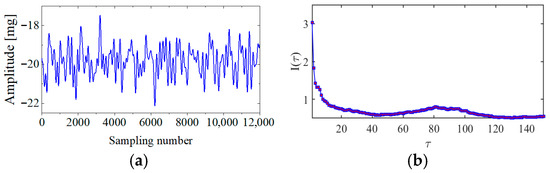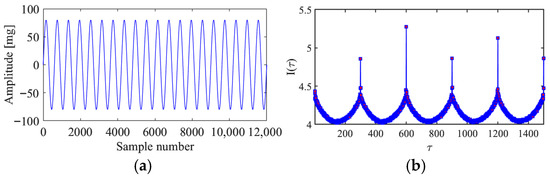 The ambient vibration signal and determination of optimal time delay. (a) The ambient vibration signal; (b) the evolution of with time delay.
