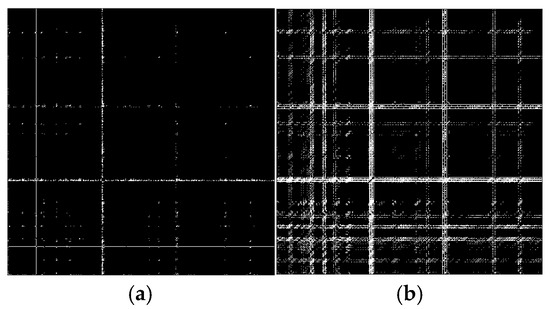 The recurrence plot of ambient vibration signal with and without optimal time delay. (a) Without optimal time delay; (b) with optimal time delay.
