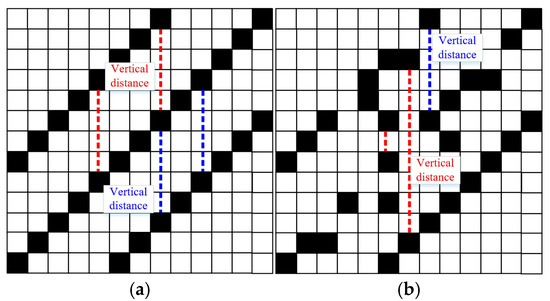 The recurrence plot visualizes the characteristic of the signal and can distinguish the VIV and the ambient vibration visually. However, in real applications, the VIV identification needs to be conducted automatically for early warning. To reach this goal, a feature index which can describe the characteristics of the recurrence plots of the VIV signal and ambient vibration signal is proposed. For a VIV signal with the optimal time delay and embedding dimension, the recurrence plot would show multiple parallel diagonal lines and the vertical distance between these diagonal lines would be stable. For an ambient vibration signal, no specific pattern can be observed and the vertical distance would have significant discreteness. The vertical distance of the VIV signal and ambient vibration signal can be explained in Figure 8. Based on this characteristic, a feature index called recurrence cycle smoothness (RCS) is proposed for VIV identification and defined as