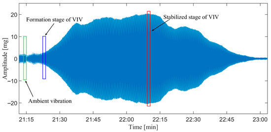 A segment of signal containing VIV and ambient vibration is utilized to validate the feasibility of the index and define a reasonable threshold for VIV identification. Figure 9 presents the vibration signal, and three segments of the signal corresponding to different vibration states are selected to analyze the RCS.