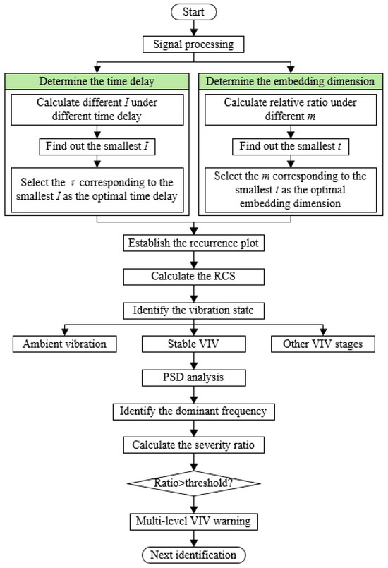 By introducing the recurrence plot and proposing the feature index, the automatic VIV identification process is established. By proposing the severity ratio to estimate the severity of VIV, the multi-level warning strategy can be established. The whole process is explained in Figure 10. In each identification, a segment of vibration data is first extracted, and the signal is then processed to remove the noise in the signal. Then MI and FNN methods are conducted to calculate the optimal time delay and embedding dimension, and the recurrence plot is established subsequently. The RCS value is then calculated according to Equation (14), and the vibration state is identified. When a VIV is identified, the power spectral density analysis is conducted to extract the dominant frequency of the VIV. Finally, the severity ratio is computed, and the warning is released based on the severity ratio.
