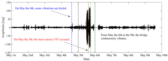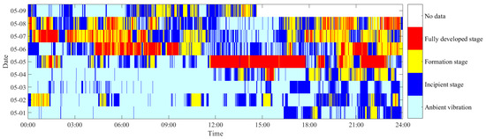 To more clearly show the evolution of the vibration state, a cloud diagram is presented to show the multi-stage identification results, as shown in Figure 14. It can be seen that continuous VIV occurred from 12:00 to 18:00 on the 5th of May, which matches with the observed vibration. It also can be seen that besides the serious VIV on the 5th of May, many stable VIVs were identified on other days. On the 1st of May, some VIVs in the formation stage are identified, and some discrete, fully developed VIVs are identified on the 2nd of May. The most serious VIV is identified in the afternoon of 5th of May, and this is the VIV observed visually. After the 5th of May, many fully developed VIVs were identified, and these VIVs were not observed and reported because the vibration amplitudes were small.