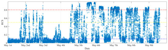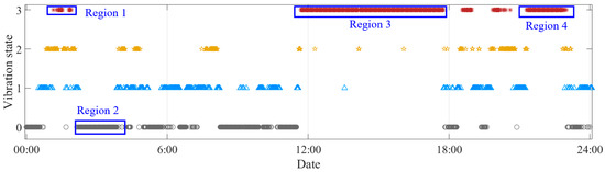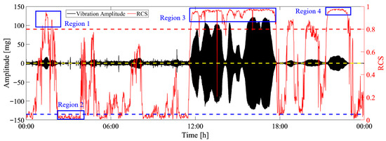 To more clearly validate the feasibility of the proposed method, the identification results on 5th of May are analyzed in detail. Figure 15 presents the original data, the calculated RCS and the thresholds. It can be seen that the RCS gradually increases when the vibration amplitude increases and becomes stable, which means the RCS can reflect the vibration state. Four regions are selected to validate the identification results, in which region 1, region 3, and region 4 are identified as stable VIVs and region 2 is identified as ambient vibration. Figure 16 presents the multi-stage identification results, in which 0–3 represent ambient vibration, incipient stage, formation stage, and fully developed stage.