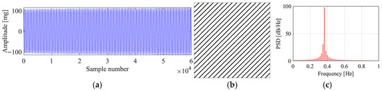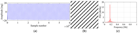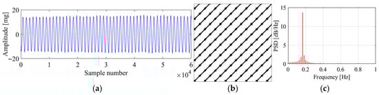 Figure 17 presents the original signal, the corresponding recurrence plot, and the PSD plot for region 1. It can be seen that the original signal is a sine wave signal with stable vibration amplitude around 18 mg. The original signal denotes that the corresponding vibration state is VIV. The recurrence plot shows clear multiple parallel diagonal lines, showing the characteristics of a VIV signal. The PSD plot shows single peak, which means only one mode dominates the vibration, matching with the characteristic that the VIV is a single mode vibration. The proposed method identifies the vibration state as stable VIV, which validates the feasibility of the proposed method in VIV identification.