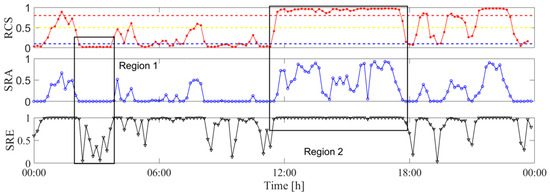 It can be seen that the trend of RCS is generally consistent with that of SRA and SRE, indicating that the proposed method almost produces the same identification method as the reference method. Region 1 shows the values of the three indices. It can be seen that RCS has the same trend as SRA, indicating that the proposed index and the reference index both can estimate the stability of the signal. The vibration states in region 1 are identified as ambient vibrations, and the results also match with the real vibration state. Region 2 shows the values of the three indices where the vibration states in this region are identified as VIVs. The SREs are close to 1, indicating that the vibration in this region is single-mode dominated. Most of the SRAs are close to 1, and this indicates that the signals in this region are with stable vibration amplitude. Even though the identification results are the same for the proposed and the reference method, RCS is more stable than SRA, indicating that the proposed method can produce stable VIV identification results.