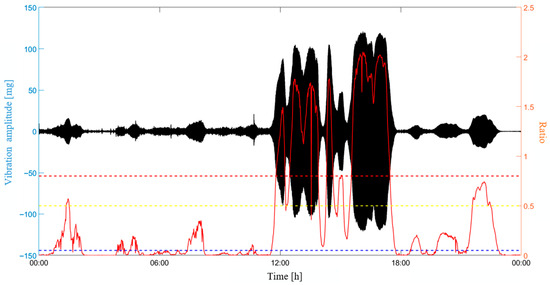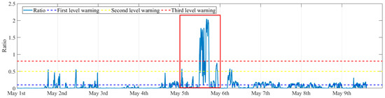Figure 23 presents in detail the evolution of the severity ratio with the vibration on the 5th of May, which is highlighted in Figure 22 with a red box. It can be observed that the severity ratio increases when VIV is identified with a large vibration amplitude. The most serious VIV occurs from 12:00 to 18:00. During this time period, the severity ratio exceeds the threshold of the third-level warning. The VIV warning matches with the reality that the most obvious VIV was observed during this time period, indicating the rationality of the proposed warning index and warning strategy.