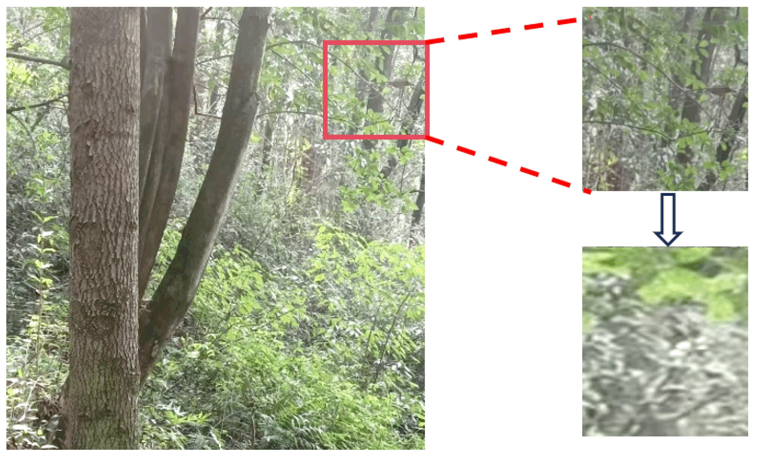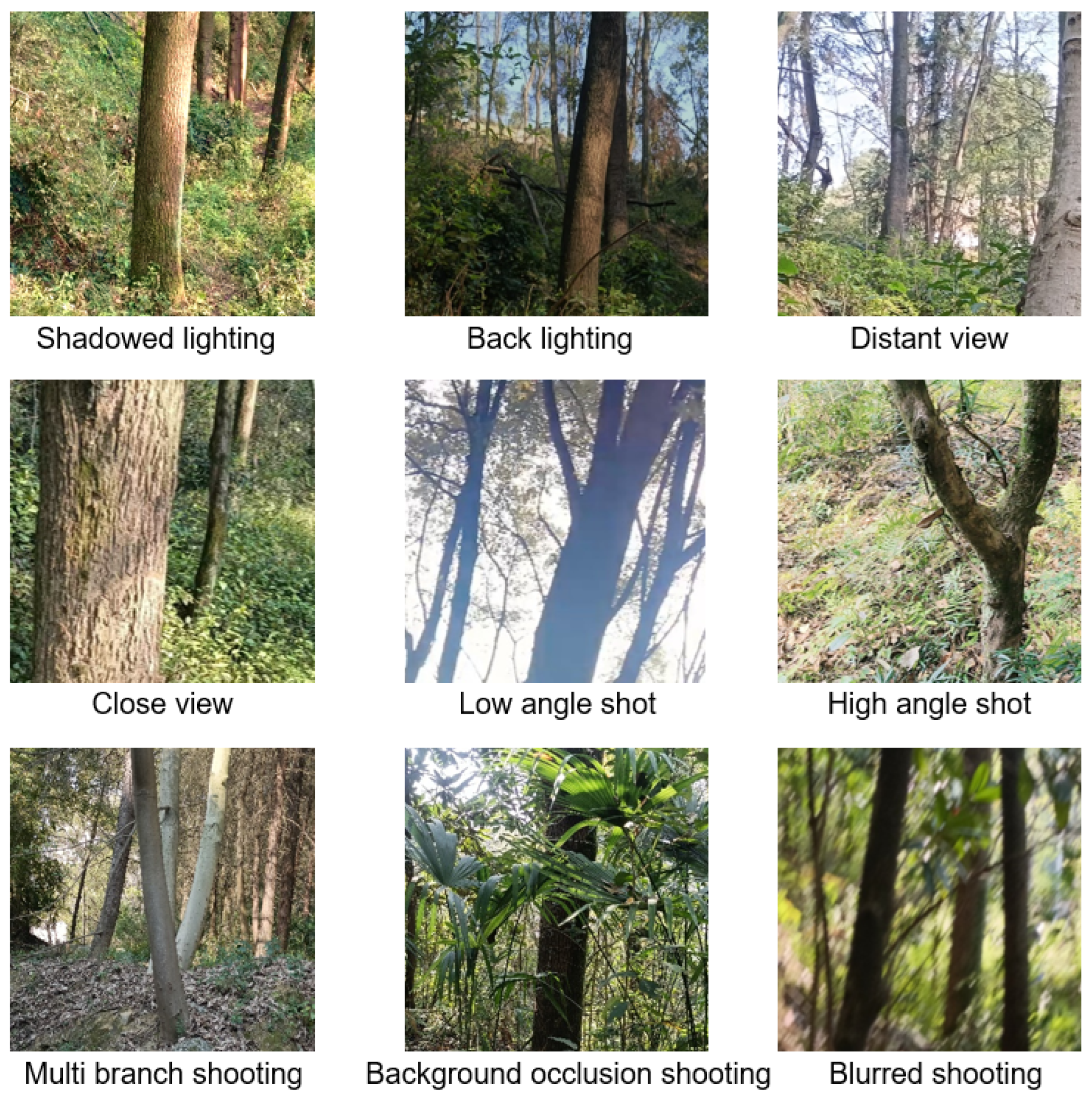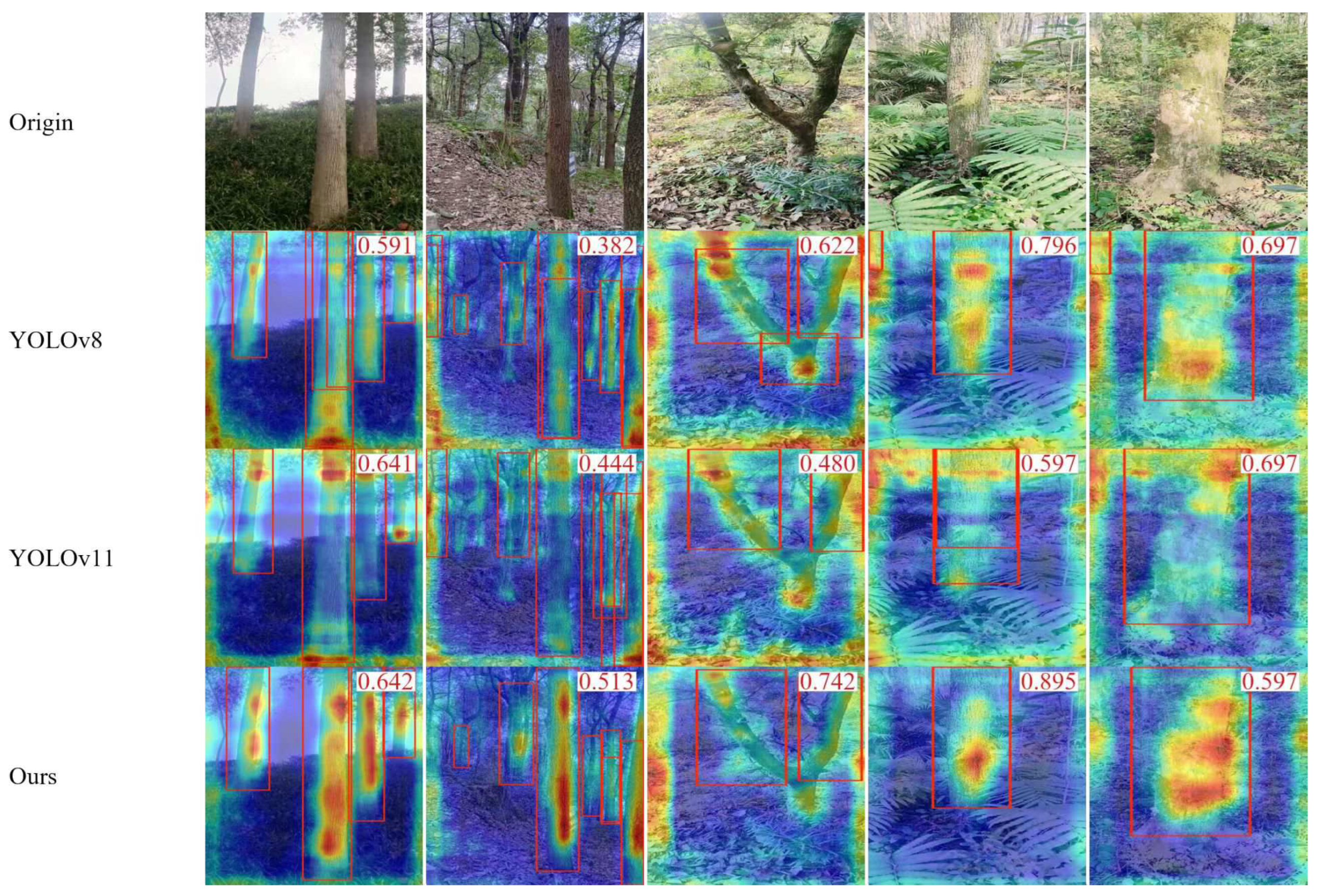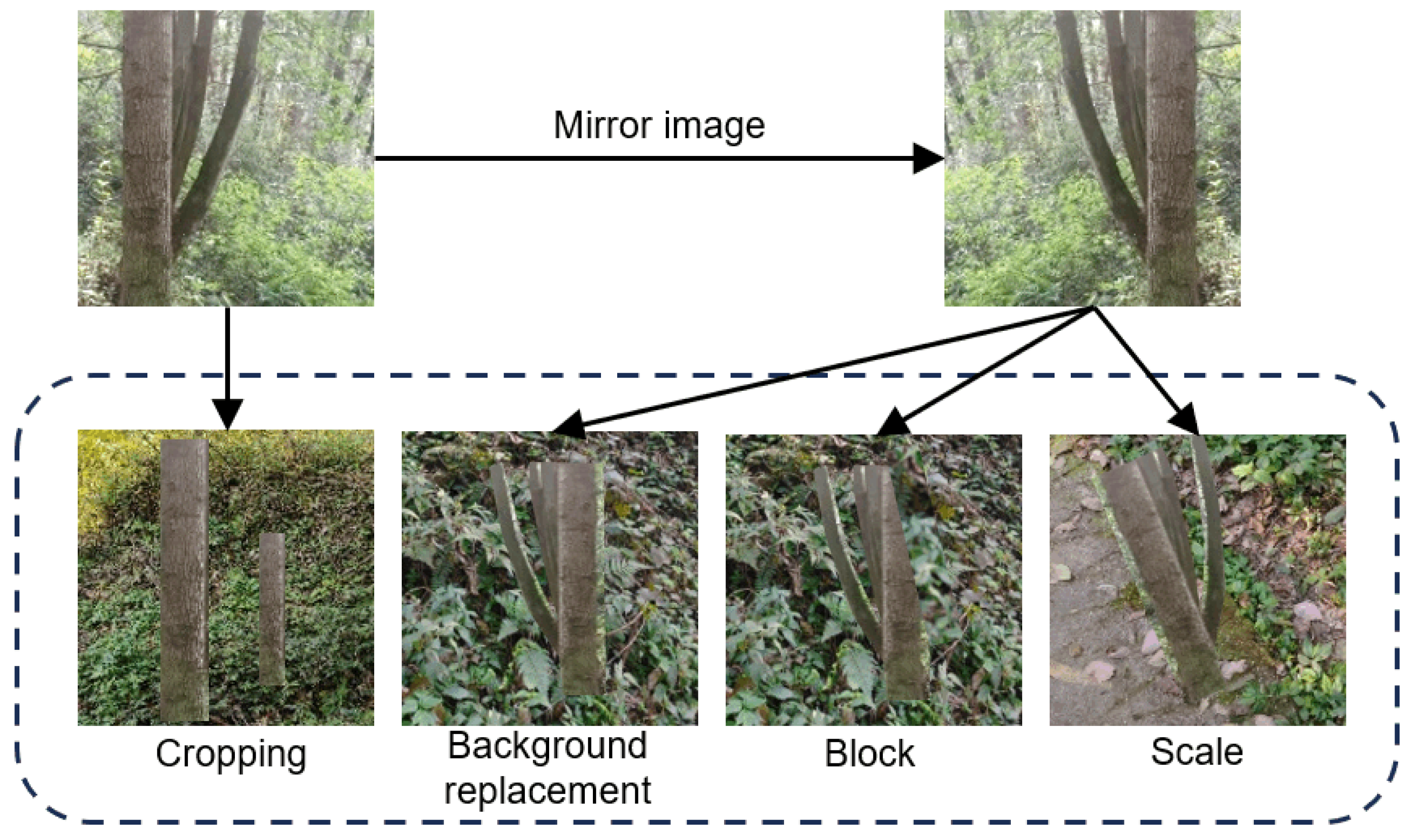 - To overcome the limitations of generic datasets and enhance model generalization for complex forest environments, we constructed a specialized dataset. This dataset was built by collecting images under various weather conditions and employing advanced data augmentation techniques, such as feature mapping transformation for background segmentation, cropping, and rotation. The processed trunk targets were then randomly scaled and superimposed onto diverse backgrounds to simulate the high variability and complexity of real-world forest scenes.