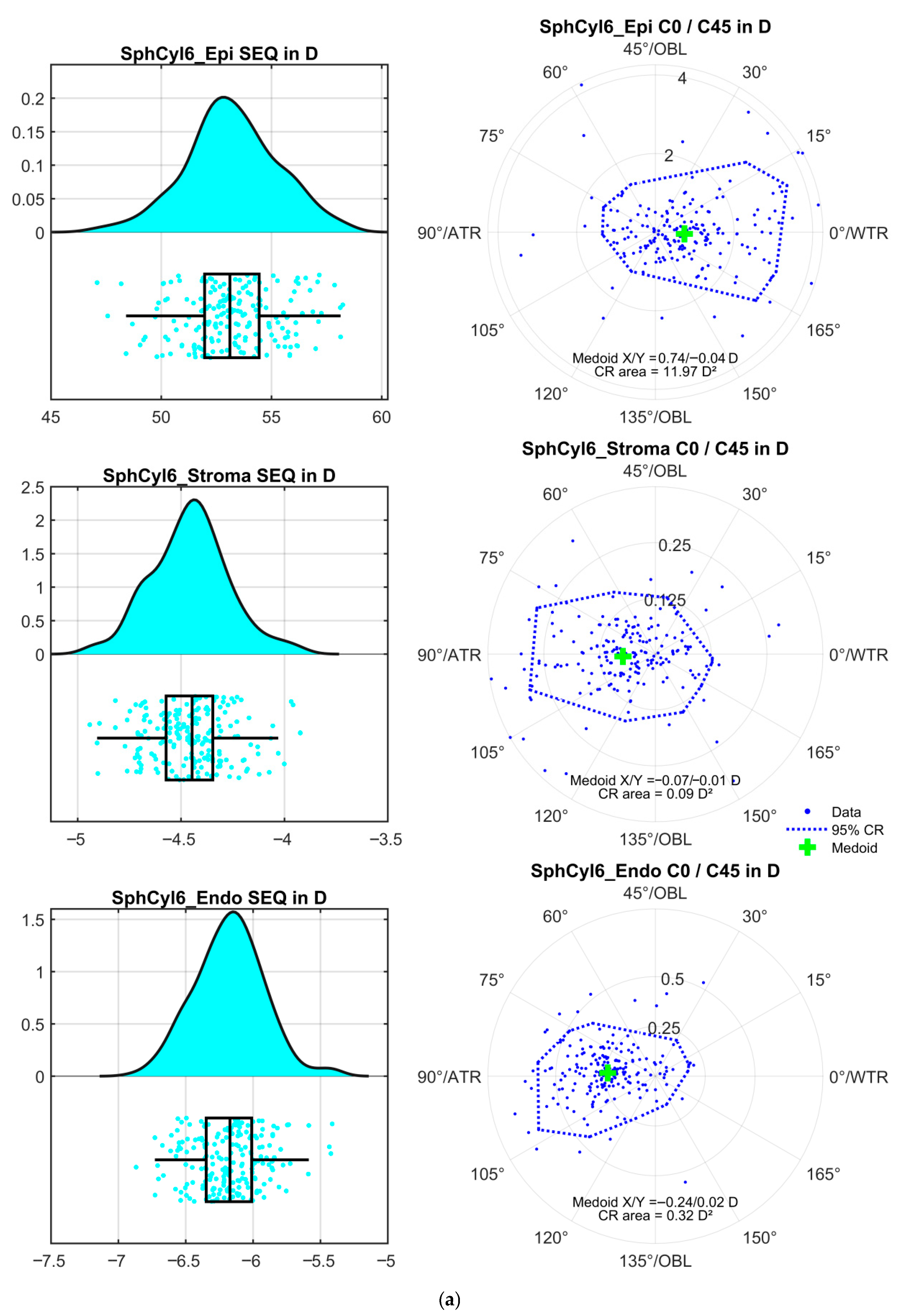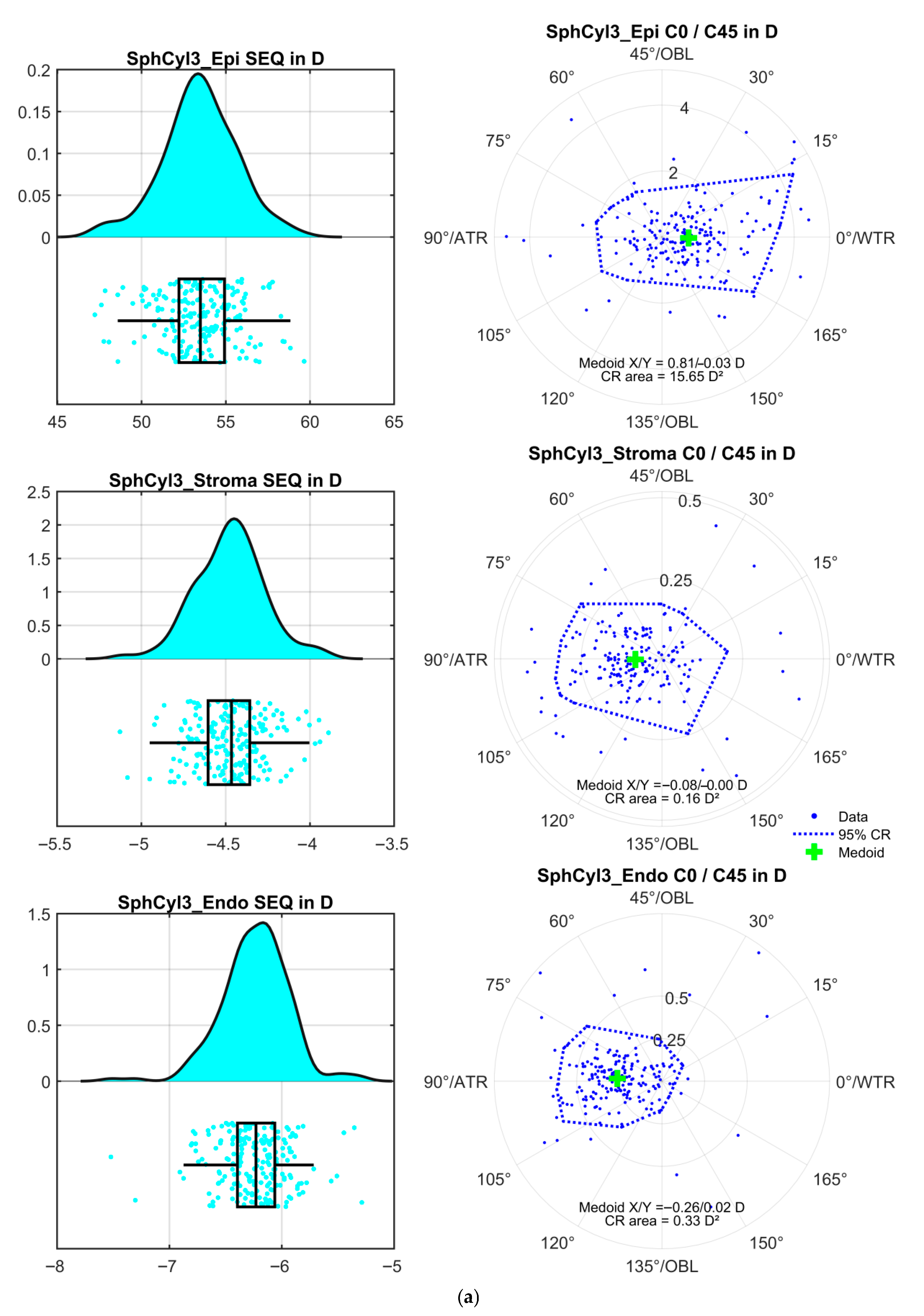 - Langenbucher, A.; Taroni, L.; Coutinho, C.P.; Cayless, A.; Szentmáry, N.; Hoffmann, P.; Wendelstein, J.; Savini, G. Evaluating keratometry and corneal astigmatism data from biometers and anterior segment tomographers and mapping it to reconstructed corneal astigmatism. Clin. Exp. Ophthalmol. 2024, 52, 627–638. [Google Scholar] [CrossRef] [PubMed]