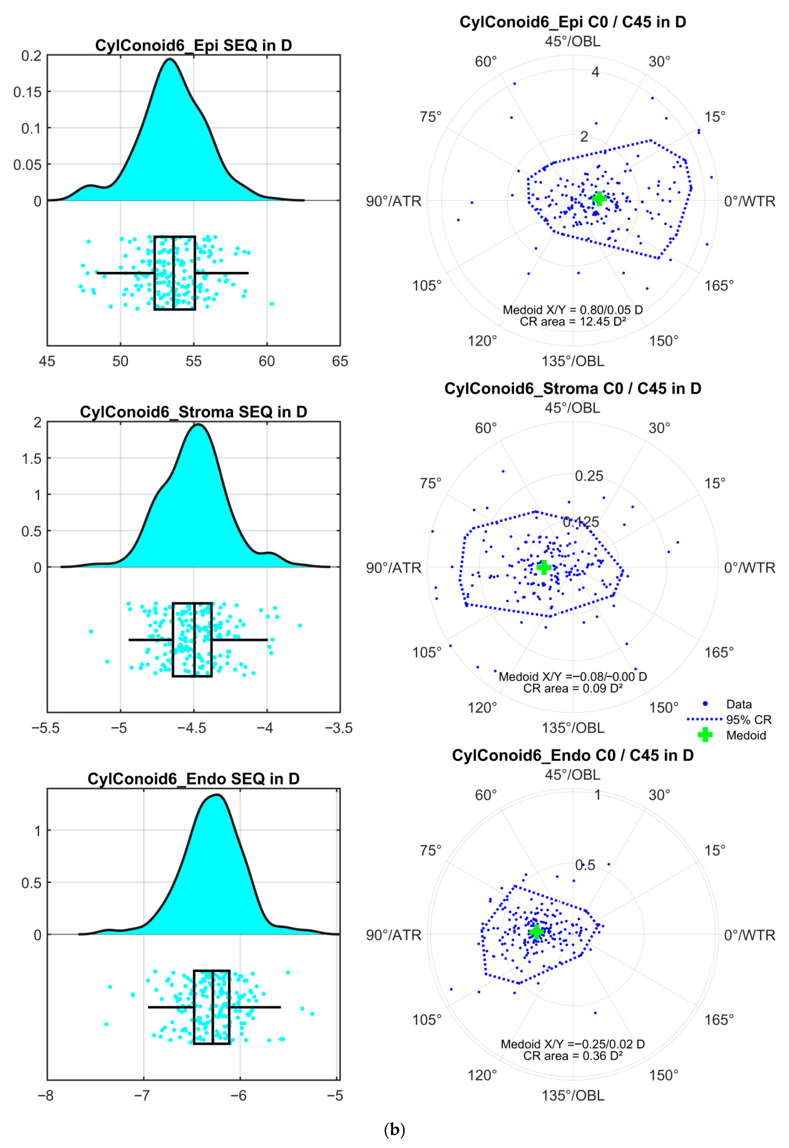 - Langenbucher, A.; Szentmáry, N.; Cayless, A.; Schartmüller, D.; Lisy, M.; Menapace, R.; Wendelstein, J.; Leydolt, C. Repeatability of corneal measurements from the Casia2 anterior segment tomographer in a cataractous population. PLoS ONE 2025, 20, e0328894. [Google Scholar] [CrossRef]