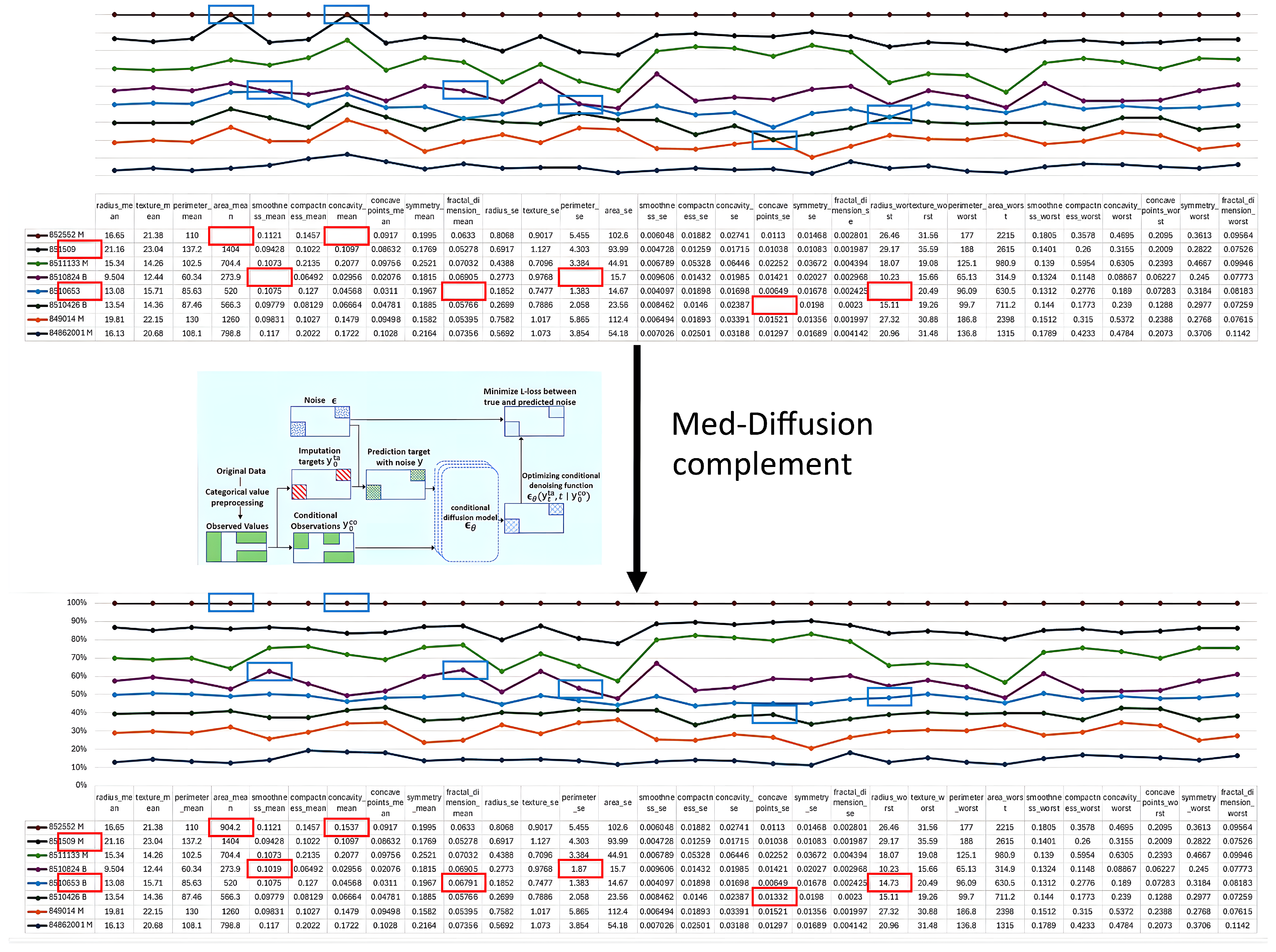 - Obtaining the Imputed Result . Finally, when , the network outputs the predicted values for the features , which are decoded to obtain . At this point, the missing regions have been filled through multiple steps of denoising, and the denoised output will be as close as possible to the true data distribution, with the observed regions remaining unchanged. This output can directly serve as the imputed result for further analysis.Through these two steps—the training phase and the inference phase—the Med-Diffusion model effectively learns to recover the missing parts of samples with missing values, providing an accurate and efficient imputation function f.