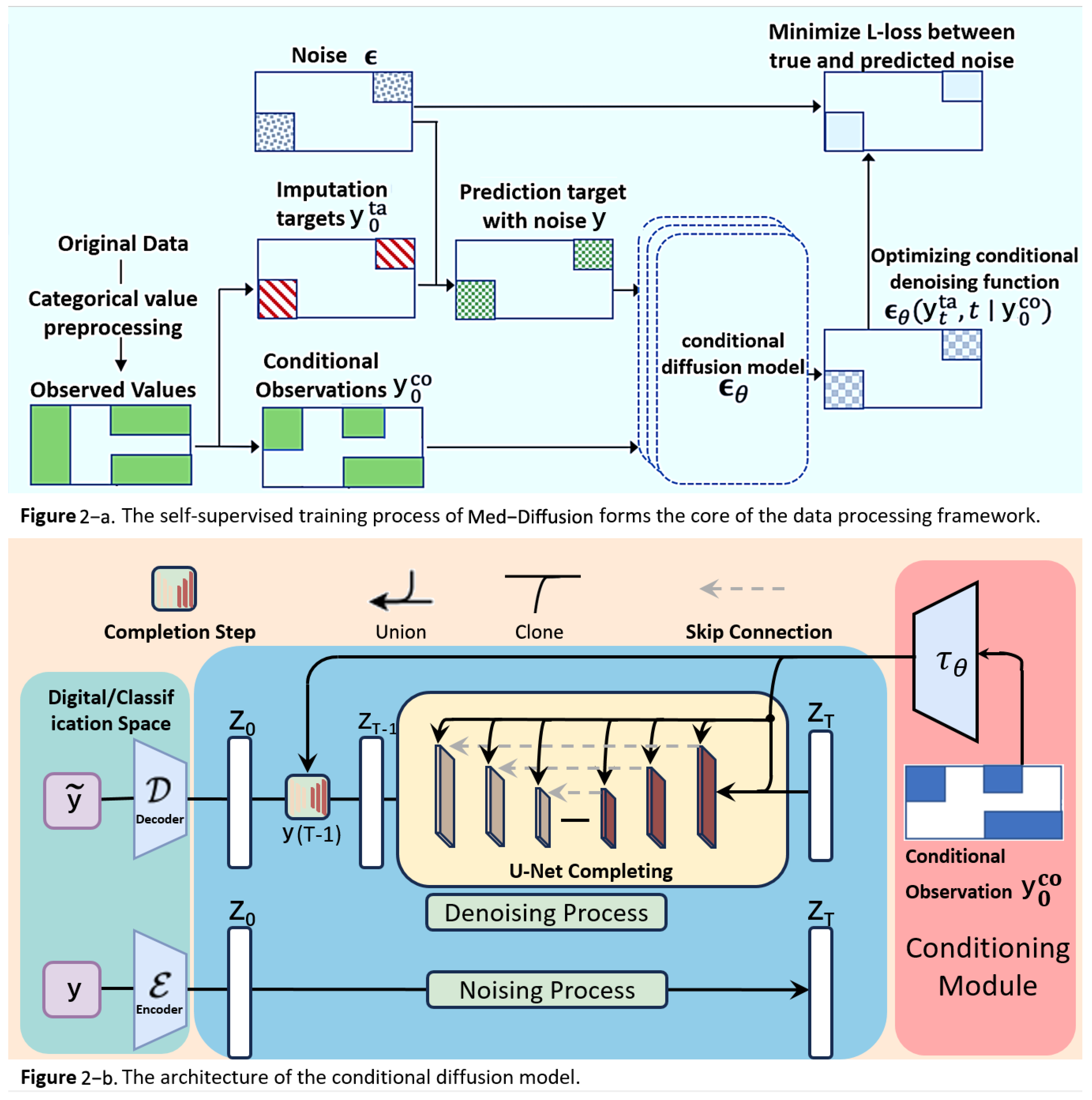 - Numerical Variables (e.g., heart rate and blood pressure). Modeling: Numerical variables are treated as continuous values, fitting the Gaussian noise assumption of the diffusion model. Imputation: During the reverse diffusion process, missing numerical values are progressively denoised to reasonable real values. For example, heart rate might recover from a noisy value to 80 beats per minute, and blood pressure may return to 120/80 mmHg. Loss Function: Mean squared error (MSE) is used to optimize the imputation results, ensuring the imputed values are close to the true distribution.